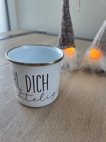Emailletasse mit Wichtelspruch.